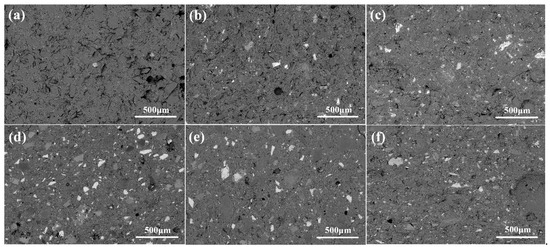 BSE images of 28 d MASM mortars: (a) M0S; (b) M5S; (c) M10S; (d) M13S; (e) M15S; (f) M20S.