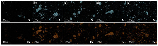Because sulfide mainly exists in the form of pyrite in SRCTs, most sulfur should co-exist with iron in the AASM mortars at the beginning of hydration. Therefore, the migration of sulfur can be obtained by comparing the element distribution of iron and sulfur. To this end, element mapping was employed to investigate the sulfur released from pyrite, as shown in Figure 4. It can be clearly seen that the area corresponding to S was reduced compared to that of Fe. This reduction indicates that the sulfur in the pyrite migrated into the surrounding paste. To further depict this migration feature of sulfur from pyrite, the migration rate of S in the pyrite was investigated using Image J software (Version 1.8.0, developed by National Institutes of Health, Bethesda, MD, USA) by calculating the area corresponding to the sulfur and iron in Figure 4, and the results are shown in Table 3. Similar to the increase in the sulfur content of the SRCT composite, the migration rate of S in the pyrite continuously increased from 4.23% of M5S to 17.21% of M20S. Although the calculated value of migration rate cannot accurately represent the actual migration of S, it was still indicated that S in the form of pyrite underwent oxidization, leading to the generation of sulfates. Thus, the sulfates participated in the hydration process of slag, driving its migration into the surrounding paste. Earlier XRD results also confirmed the formation of sulfate-containing hydration products due to the incorporation of SRCTs into MASMs.