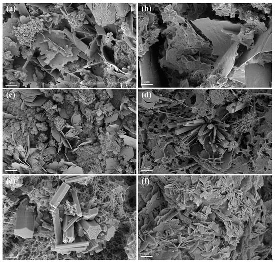 Figure 5 shows representative SEM images of 28d MASMs with different SRCT composites. It can be seen that many lamellar crystals were found in mortars without SRCTs, which were likely hydrotalcite [30]. A mesh gel structure was obtained when SRCT composite with 5% sulfur content was added, as shown in Figure 5b, suggesting a higher degree of hydration. This was mainly attributed to the auxiliary activating effect of the generated sulfates on the hydration of MASM. Figure 5d,e shows some rod-like products, possibly ettringite and gypsum, according to the results of XRD analysis. Based on the above analysis, the auxiliary activation effect exerted by the generated sulfates through the oxidization of pyrite can be confirmed, further influencing the compressive strength and pore structure of MASMs.