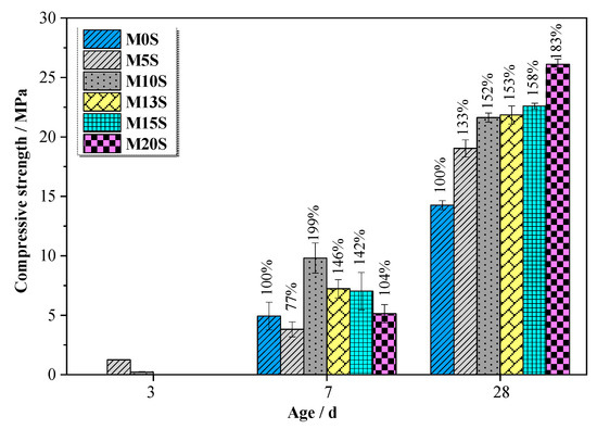 Figure 6 presents the compressive strength of MASM mortars at 3d, 7d, and 28d. The strength development of all MASMs was extremely slow at an early age. This is because MgO is a comparatively weak alkali compared with NaOH and KOH. The hydrolysis of MgO cannot provide a sufficient alkaline environment to break the covalent bonds (Si–O–Si and Al–O–Si) in the slag, so that few hydration products can be formed at an early age [31]. At 7d, most mortars prepared with SRCTs possessed higher compressive strength than those prepared with pure quartz sand, except M5S. An almost 100% strength enhancement was obtained in the mortar prepared with SRCTs with a 10% sulfur content. This is because sulfate can also be generated from the oxidation of pyrite in the alkaline solution [32]. As mentioned earlier, sulfate can activate the slag along with MgO, thus resulting in a much higher compressive strength. Furthermore, there is a synergistic effect between sulfate and MgO on enhancing the performance of AASMs [24]. The presence of sulfate can activate the slag along with the MgO at the same time.