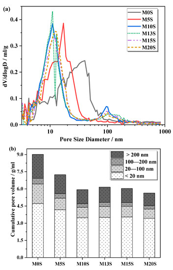 Figure 7 shows the MIP results of 28d MASM mortars with and without SRCT composite. As shown in Figure 7a, the MIP curves of SRCT-incorporated mortars are generally on the left side of that of M0S. In addition, the major peaks of the MIP curves tend to shift to the left side of this figure when SRCT composites contain more sulfur contents. This change in the MIP curves among MASM mortars indicates that the incorporation of SRCT composite into MASM modified its pore structure by forming a denser microstructure. Figure 7b further presents the calculated accumulative pore volumes within different zones based on Figure 7a. The total porosity of 28d AASM mortars reduced from 9% to 7.2% by replacing partial natural sand with SRCT composite. When SRCT composite replaced all the quartz sand, the porosity was further reduced to 5.6% (M13S). The amount of harmful pores (>200 nm) [33] was significantly reduced, which is often observed in MASMs with a higher degree of hydration [22]. All these findings agree well with the above results. Thus, the hypothesis regarding the auxiliary activation of SRCTs is further confirmed because the introduction of SRCTs into the MASMs additionally produced expansive sulfate-containing products into the microstructure of MASMs. As a result, refined pore structure can be achieved in SRCT-incorporated MASM mortars.