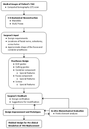 Methodology followed for design and preliminary analysis of the patient-specific total temporomandibular joint (TMJ) prostheses.