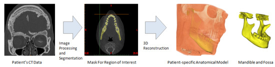 Subject-specific 3D anatomical reconstruction of the patient’s mandible and skull/fossa/articular eminence is performed using commercial software Mimics v14.12 (Materialise, Plymouth, MI, USA) from computed tomography (CT) scans (see Figure 2). Upon importing the patient’s CT images in Mimics, anatomical model comprising of the patient’s mandible and fossa eminence is developed by performing a series of operations such as image processing, segmentation, region growing, mask formation for the anatomic region of interest (i.e., bone and teeth), and calculation of 3D equivalent similar to the 3D reconstruction method described elsewhere [18]. The prostheses and accessories are designed using commercial software packages 3-matic v6.0 (Materialise, Plymouth, MI, USA) and SolidWorks v2010 (SIMULIA, Providence, RI, USA) as discussed in following sections.