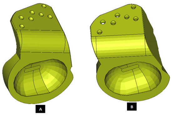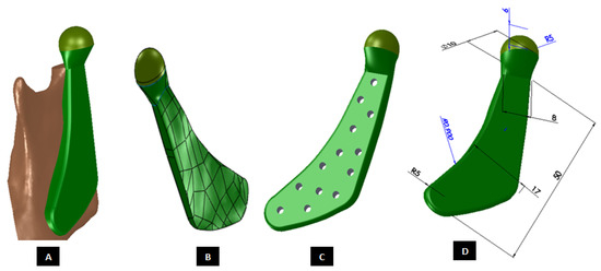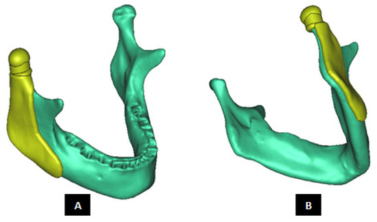 Shape outline of a custom-designed condylar/ramus prosthesis for the replacement of right TMJ of a patient. (A,B) Show lateral–anterior view and lateral–posterior view, respectively, of the prosthesis accurately conforming to geometric shape of patient’s mandible.