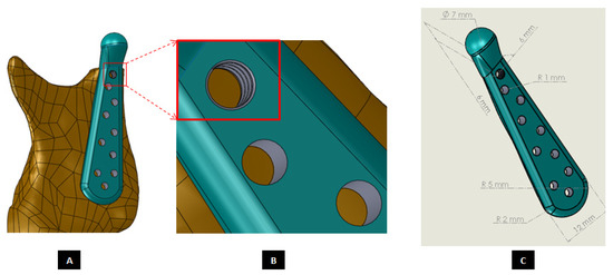 Custom-designed condylar/ramus component of the TMJ total joint replacement prosthesis for left TMJ of a patient. (A) Shows lateral view of the implant with screw holes. (B) Shows an enlarged view of the screw holes, where the first superiorly located screw hole has threads to incorporate locking-plate-screw mechanism by engaging the threads on the head of a locking screw described in the text. (C) Shows engineering dimensions of this patient-specific implant.