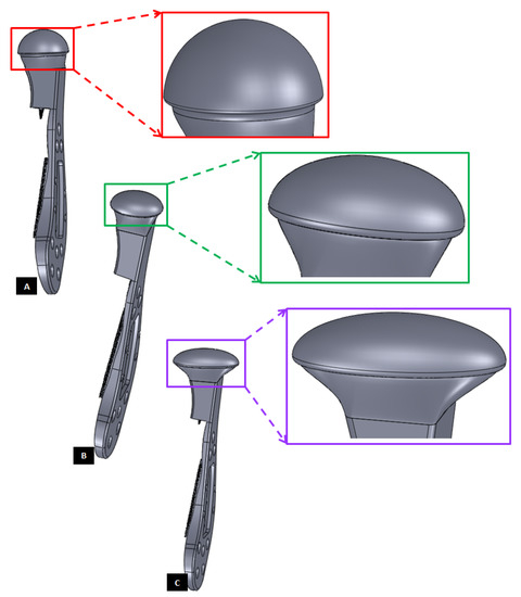 Different shapes of the condylar head of the custom-designed condylar/ramus component of the TMJ prosthesis. (A) Shows a prosthesis with spherical condylar head. (B,C) Show prostheses with elliptical head of different dimensions. The condylar heads are designed to offer larger articulating surface area to avoid stress concentration at small area which may lead to more wear of the articulating surfaces of reconstructed TMJ.