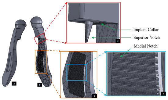 Modification of the custom-designed condylar/ramus component, shown in Figure 9, to include a novel feature; perforated notches protruding into host bone at implantation. (A) Shows a grove in the flat lateral surface of the condylar implant. The opposite side of this grove, as shown in (B), protrudes out of the medial surface as a notch with perforations. The enlarged views of medial notch and its perforations are shown in (D,E). The device also has pointed and perforated notch protruding from inferior surface of the implant’s collar/neck. Perforated surfaces of these notches are designed to permit bone in-growth into the prosthesis after implantation to provide added stability. Dimensions of these notches can be customized to fit the size and shape of patient’s native bone. Protrudes out of the medial surface as a notch with perforations (C).