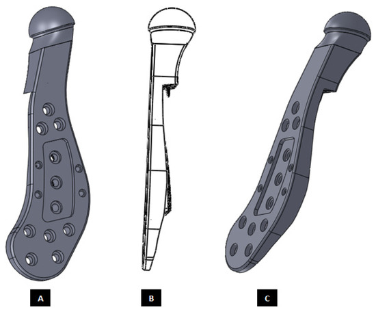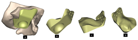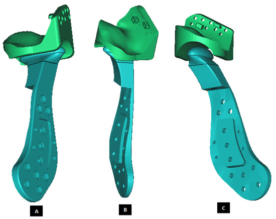 Shape outline of a custom-designed condylar/ramus prosthesis. (A,B) Show medial–anterior view and lateral–anterior view, respectively, of the prosthesis accurately adapting to the host bone. (C) Shows medial-inferior view of the prosthesis shape outline.