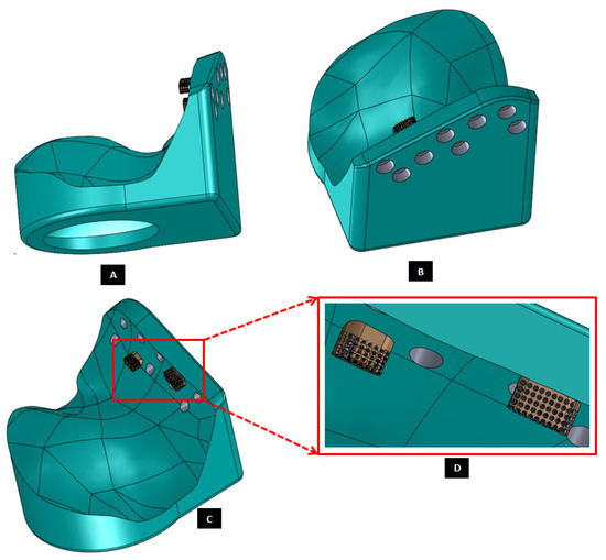 Patient-specific design of fossa prosthesis. Inferior rectangular surface of the device has a circular grove for articulation with condylar head (A,B). Visuals illustrate customized size and shape of the device for accurate fit and fixation (C,D) to native anatomical structure. Superior edge of the lateral surface (which hosts screw holes) is custom cut to follow the curvature of native eminence and bone situation.