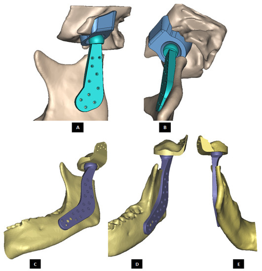 Shape outline of a custom-designed condylar/ramus/mandibular component of the TMJ prosthesis for reconstruction of left TMJ. (A,B) Show medial–anterior view and lateral–anterior view, respectively, of the prosthesis along with 3D anatomical model of the patient’s mandible after condylectomy. The osteotomy gap seen in the left mandibular body is due to removal of a tumor in that region. This osteotomy gap can be filled with a graft, and the mandibular component of this TMJ prosthesis is designed to provide mechanical support to the host bone and graft.