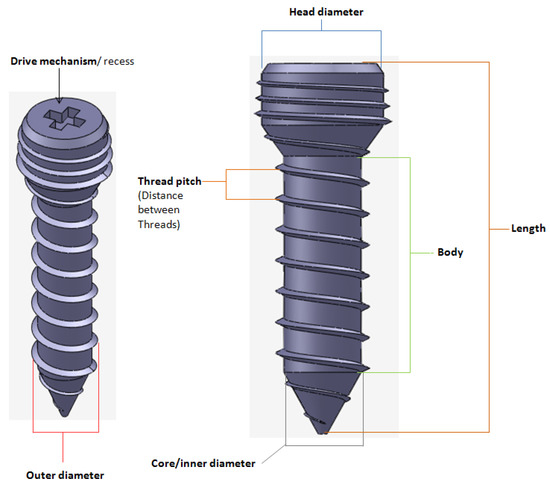 A custom-designed locking screw for TMJ prosthesis. Visuals show different features of the screw. Total length of the screw depends on the size of prosthesis and native bone. The body/shaft of screw is designed long enough to utilize maximum amount of host bone (condyle/ramus or fossa eminence) but avoid protrusion of screws from medial surface of the bone. Length of the screw head varies depending on the thickness of condylar or fossa prosthesis in the particular screw-hole location. The outer diameter of screw is kept in the range of 1.5 mm–3.00 mm as this range is reported to be optimal for the screws of TMJ implants. The screw has varying pitch, with more threads per unit length of screw-head than the body/shaft.