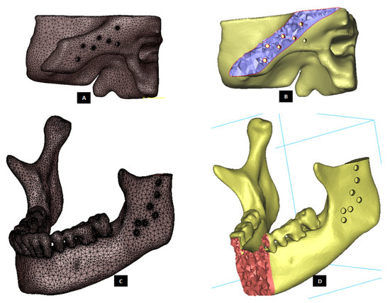 Three-D finite element mesh of the host bone components prepared for total prosthetic replacement of the left TMJ. (A) Shows FE surface mesh of left fossa, and (B) shows a lateral cross-section of the 3D volume mesh of left fossa bone with screw holes. Similarly, (C,D) show surface mesh and anterior cross-section of volume mesh, respectively, of the mandible with screw holes and removal of damaged left condyle.