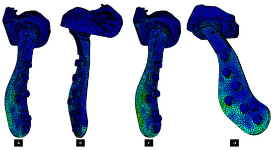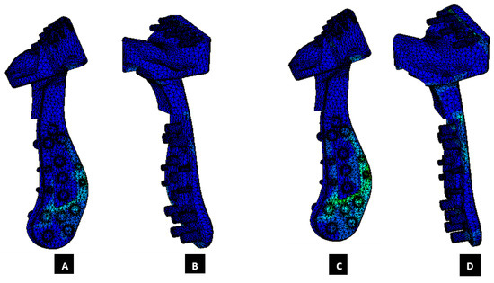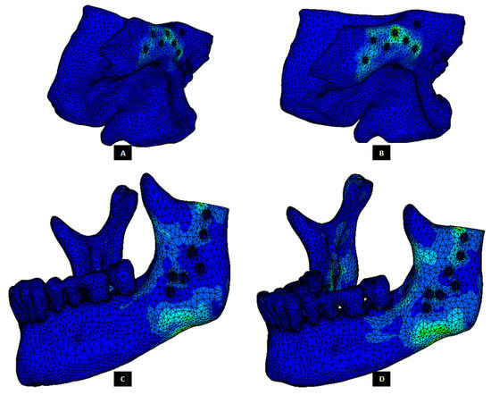 Peak von Mises stress in patient-specific ‘simple’ TMJ prosthesis (without notches) during FE simulations of two different loading scenarios. (A,B) Show von Mises total TMJ prosthesis under normal loading configuration. (C,D) Show von Mises stress profile in the prosthesis during FE simulation of worst-case/over-loading scenario.
