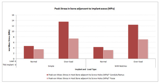 Peak von Mises stress in the mandibular and fossa bone adjacent to fixation screws of total TMJ prostheses during FE simulations under normal and worst-case/over-load configurations.