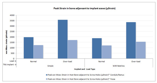 Small difference in the stress and micro-strain occurred in the host bone adjacent to screws in condylar and fossa components of both total TMJ prosthesis systems. For both types of implant designs, von Mises stress in the bone surrounding fixation screws was in the range of 3.2–4.7 MPa and 7.1–13.6 MPa under normal loading and over–loading, respectively (see Table 5, Figure 29 and Figure 31). These results are comparable to the findings reported by [31] who studied stress distribution in the screws of a condylar implant and host bone. von Mises strain in the bone surrounding prosthetic screws ranged from 1210 microstrain to 1983 microstrain during normal loading, and from 1564 microstrain to 3586 microstrain during over-loading condition. A strain higher than 4000 microstrain can cause hypotrophy of bone [32]. The highest micro-strain in host bone in this study is below the hypertrophy limit. Moreover, use of more screws at appropriate locations would further lower the chances of higher strains capable of bone formation around the screws.
