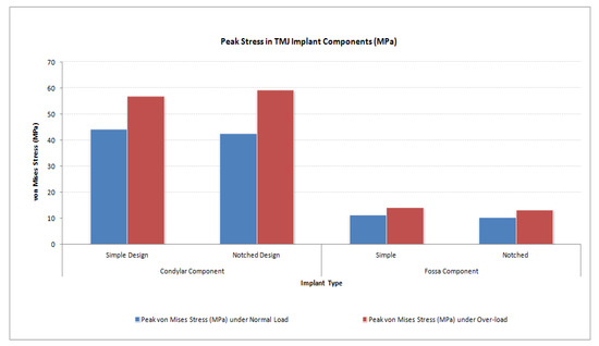 Peak von Mises stress in condylar/ramus and fossa components of patient-specific total TMJ prostheses during FE simulations under normal and worst-case/over-load configurations.