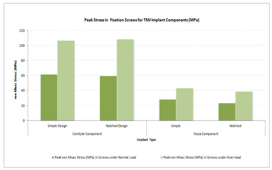 Peak stress and strain the implant fixation screws are summarized in Table 4 and Figure 36. In fixation screws for condylar and fossa components, the highest magnitude of stress values occurred at the neck portion of screws. However, the highest stresses in all screws were found to be less than the ultimate stress as well as yield point of the screw material (Ti-6Al-4V). This trend of stress profile in screws is similar to that reported in [31] who studied stress distribution in a stock condylar prosthesis and screws using FE method. The highest von Mises stresses found in screws in the present study are much lower than those reported in [31]. This discrepancy suggests that screws used for fixation of the condylar component of patientspecific total TMJ prostheses undergo lower load and resultant stress while transferring the functional loads between implant and host bone. This further suggests that the custom-designed implants offer better adaptation to the host bone (compared to their stock counterparts) and partly transfer the load directly to the bone in contact (e.g., at the location where condylar collar of the implant sits superiorly on natural ramus after condylectomy), thereby reducing the exposure of screws to higher loads and stresses.