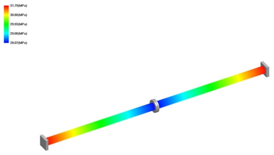In order to examine the influence of gas pressure and joint bending on the leakage level, a special test rig was designed and built. In the experimental test, the pipe was shortened to 1000 mm. The reason for this was the limited laboratory space as well as the maximal force generated by the hydraulic piston that bent the pipeline. In order to maintain the same displacement in the flange joint location, an additional radial force had to be applied. The value of such a force was determined by means of a flexibility analysis with the CAEPIPE software (SST Systems, Inc., San Jose, CA, USA), according to Figure 4. Example of the graphical results of the shorter model is shown in Figure 5.
