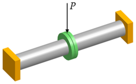 - Displacement causing the pipeline bending (Figure 12d). The surface where the displacement vector was defined was the place of the ring connection with a hydraulic exciter in the test stand. A bending simulation was carried out for the following three displacement (pipeline deflection) options: 1.2 mm, 0.8 mm, and 0.4 mm.