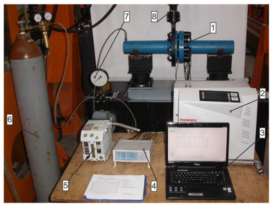 Figure 6 shows the stand where the experimental tests were carried out. The stand was used, e.g., for evaluation of the tightness of static gaskets operating under forced vibrations. A flanged-bolted joint (1) of two sections of pipes plugged with bottom plugs at both ends makes up the basic element of the stand. The construction, after mounting the gasket between the connected surfaces of the flanges, and appropriate tensioning of the joint bolts make a closed pressure vessel. The dimensions of the flanges complied with the PN-EN 13445-1 standard [21] (according to Table 1), with raised faces of type B and sealed fluid pressure of PN 100 bar. The tank was loaded with a pressure (2 MPa) of gas supplied from the reservoir (6). The model pipeline fragment rested on two supports: a right fixing support and a left displacement support. In order to induce variable pipeline loads (bending), the left flange was tightly fitted in a metal ring, which was then connected with the head (8), in turn making a part of the hydraulic cylinder act as a forced generator.