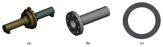 Mapping of the contact surface was used in the contact places between the gasket and the flange-raised face. The generated FEM mesh for each element and the pipeline assembly is presented in Figure 8.
