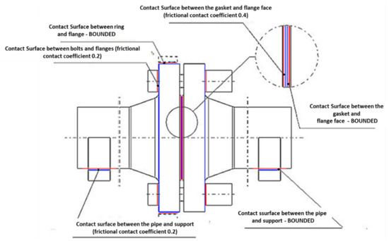 The coefficient of friction on the bearing surface of the flanges with the nut and bolt head surface was assumed as 0.15, whereas, in the case of the face contact surface of the gasket with the flange-raised face, the value was assumed as 0.4. The “BOUNDED”-type contact was used on the contact surface of the gasket with the right flange-raised face. The contact ensured bonding of the gasket with the flange, preventing the “escape” of the gasket at the pipeline bending. The types of contact defined between particular elements are presented in Table 3.