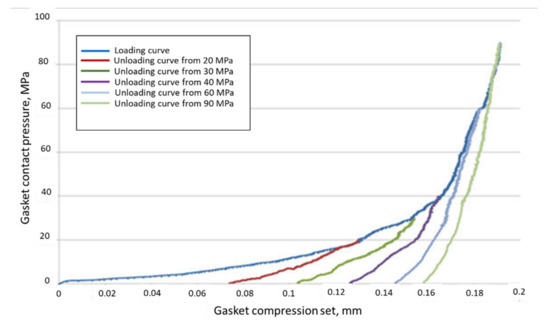The material characteristics of steel elements (except the gasket) were modelled as follows: Elasticity modulus E = 205 GPa and Poisson’s ratio v = 0.3. The gasket’s elasticity characteristics were obtained for the gasket’s tests according to the standards in [13,22]. Sample elastic characteristics of a 2-mm-thick fibre–elastomer gasket are presented in Figure 10.