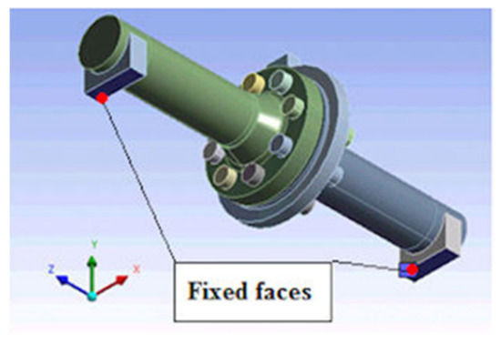 Since the test-supporting frame was neglected in the analysis, a fixed support was introduced onto the contact surface of the supports (Figure 11).