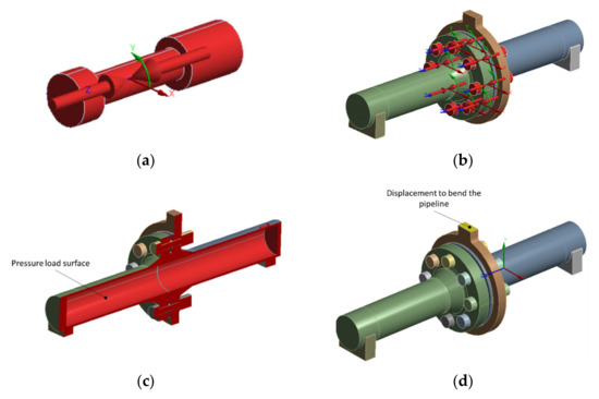 Figure 12. Flange joint load: (a) view of a bolt with a marked vector of the bolt-shortening direction; (b) view of the bolt assembly in the flanged joint; (c) joint load surface with 2 MPa pressure; (d) defining the displacement vector towards which the pipeline fragment was bent. - Internal pipeline pressure of 2 MPa. Figure 12c shows the internal surfaces that the pressure was applied to. In this case, the internal pipeline walls and internal lateral surface of the gasket are the load surfaces.