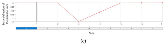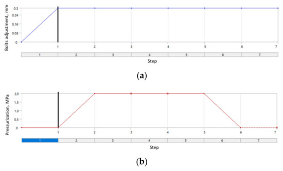 With regard to the fact that the real assembly was subject to loading in steps, the numerical analysis was divided into stages, where each kind of load was applied in the following order: (1) introducing the initial tension of bolts; (2) introducing the static pressure acting on the surfaces of the model; (3) triggering the static deflection of the pipeline to the set displacement value; (4) unloading caused by the displacement; (5) unloading of the system with internal pressure; (6) complete unloading of the bolt tension. The course of each stage of the numerical analysis is presented in Figure 13.
