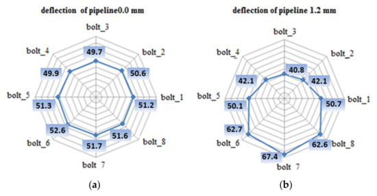 A pipeline deflection value of 1.2 mm causes a decrease in the tension of bolts 2, 3, and 4 to 41.7, 39.4, and 41.7 kN, respectively. For bolts 1 and 5, a minor drop in the load to the value of 51.4 kN per bolt was observed. Tension increases to 63.3, 68.7, and 63.2 kN were recorded for bolts 6, 7, and 8, respectively. Table 4 presents the experiment results for the tension value in the bolts that remained after complete pipeline unloading from the deflection.