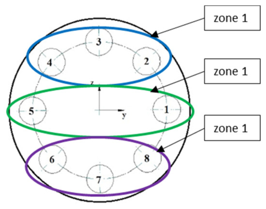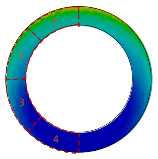 For this reason, in the next approach, it was decided to distinguish characteristic gasket zones in which there is an increase or decrease in pressure in relation to the assembly state. Afterwards, the pressures that were calculated in these zones were related to the leakage level. Due to the axial symmetry of the model, four characteristic zones with the same surface were taken into account, as shown in Figure 19.