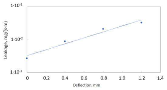 Figure 16 presents the results of measurements of helium leaking from the joint under the influence of the loading that results from the assembly tension of the bolts, helium pressure, and the deflection of the pipeline. Under the assembly tension of the bolts and the pressure of 20 bar, the leakage value is equal to 2.7 × 10−3 mg/(s·m). It is worth noting that this value is within the assumed design tightness class of 0.001 mg/(s·m). It turned out that significant changes in the leakage even occur with small deflections of the pipeline (close to 1 mm). In the case of the deflection by 0.4 mm, the leakage increases to 8.8 × 10−3 mg/(s·m). In turn, with the deflection by 0.8 mm, the leakage level increased to 2.1 × 10−2 mg/(s·m), while, with the deflection by 1.2 mm, the leakage value was equal to 3.3 × 10−2 mg/(s·m), which significantly exceeded the tightness class of 0.001 mg/(s·m). Undoubtedly, the gradual increase in the deflection of the pipeline causes an uneven distribution of pressure on the surface of the gasket, which, in turn, causes the pressure to increase in some areas and decrease in other areas.