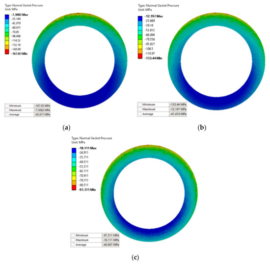Pressure distribution on the surface of the gasket due to the deflection of the pipeline by: (a) 1.2 mm, (b) 0.8 mm, and (c) 0.4 mm.