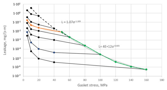 The empirical leakage equation presented in Formulas (1) and (2) results directly from the mathematical interpolation of the leakage curve that occurs when the gasket is unloaded and loaded from the assembly pressure of 50 MPa (Figure 18). The leakage value from the entire gasket’s circumference is calculated as the sum of the leakage calculated from individual zones and is related to the average circumference of this zone: