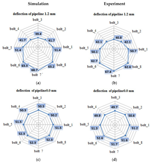 The distribution of the tension in the bolts in the real joint and the calculation model: (a) the distribution of bolt tension in the calculation model due to 1.2 mm deflection; (b) the distribution of bolt tension in the real joint due to 1.2 mm deflection; (c) the distribution of bolt tension in the calculation model before deflection; (d) the distribution of bolt tension in the real joint before deflection.