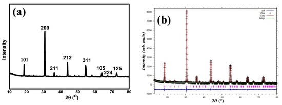 where K is the constant value, which is 0.9; β is the full width at half maximum (FWHM); θ is the angle of XRD peaks; and λ is the wavelength of XRD beam in nm [,]. Both the calculated tilting angle and crystallite size of this compound were 11.40° and 10.71 nm, respectively.