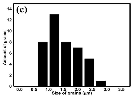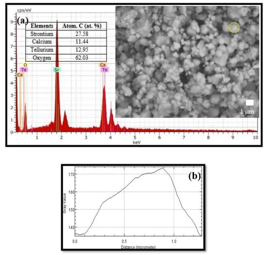 Figure 4a exhibits the morphology of the Sr2CaTeO6 compound. The formation of agglomerated grains with almost the same shape and size distribution as most grains was clear. The agglomerated particles in this compound were most probably due to the fast nucleation rate of grains, which was caused by high temperatures of calcination and sintering. Thus, this caused the grains to become accumulated since there was not enough duration for the grains to separate well from each other []. The formation of grains can be confirmed in Figure 4b, where the shape of the top cross-section of a grain (marked with a yellow circle in Figure 4a) formed a hill shape. The obtained grain size distributions are displayed in Figure 4c. The measured distribution grain sizes were within the range of 0.7–2.5 μm, with the majority of the grains’ sizes between 1.0 and 1.5 μm, while there were fewer grains with sizes greater than 2.0 μm. These sizes were relatively larger compared to other tellurium-based double perovskites [,]. EDX graph in Figure 4a exhibits constituted elements in this sample, which confirms that these compounds contain elements of the prepared raw material composition, except Au, which originates from the coating in sample preparation for SEM characterisation. The sample’s density is 5.755 g cm−3, as calculated by the Archimedes method.