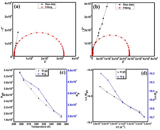 where t = thickness of the sample, which is 2.05 mm; R = resistance of grain boundaries/grain; and A = area of electrodes attached to sample, which is 0.19 cm2. From Figure 5d, the DC conductivity at various temperatures obeyed the Arrhenius equation, as in Equation (5) []:
