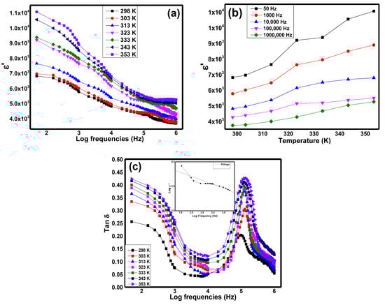 From Figure 6c, the high values of Tan δ at initial frequencies corresponded to the drop in ε′ in the same frequency range as in Figure 6a due to the movement of charge carriers within the grains or between the grain boundaries and grains. This movement would then cause the leakage current flow in the form of DC conduction during the alternation of the external field. This deduction is supported by the value (−1) of the gradient in log ε″ vs. log f plot in Figure 6c. In addition, the inability of these electrical charges to effectively abide by the external field alternation could be a factor in assisting the high value of the loss. At low frequencies, the increased value of loss as temperature increases implied the increase in dynamic of the charge carriers and contributed to the enhancement of DC conductivity. The existence of peaks at higher frequencies at each temperature and their shifting towards the higher temperatures implied the presence of relaxation peaks at the respective frequencies. The presence of these peaks indicated the impotence of the charges to follow the alternation of the field due to AC conductivity or heat loss. The increase in the peak loss with temperature, however, indicated the increase in carriers’ movements, which strongly implies the presence of AC conductivity at high frequencies.