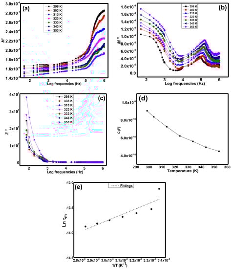 From Figure 7a, the small values of M′ at initial frequencies can be related to the tendency for electrode effects to be suppressed and not contribute to the total electrical conductivity in this sample. In the low gradient region, it shows the almost plateau variation in M′ and low electrical stiffness. This variation indicates that long-range conduction exists within the compound. On the other hand, the dispersed high slope region indicates the presence of short-range electrical conductivity at high frequencies, which means the localised conduction mechanisms of charge carriers exist within this frequency range. It is believed that carriers only move within their respective potential wells, led by the absence of the restoring force []. With the presence of higher frequencies of an external field, the movement of charge carriers was merely conducted by the external field and hence, increased the electrical stiffness. The dispersion could also indicate the temperature-dependent relaxation process could take place within this frequency range. As the temperature elevated, the M′ values decreased, which can be deduced that motions of charge carriers enhanced with temperatures. The shifting of the dispersion region towards lower frequencies as temperature elevated could indicate the short-range conduction took place.