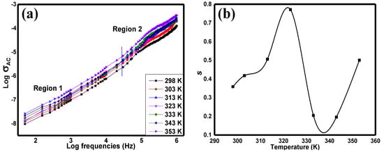 From Figure 8a, in region 1, the plateau region could be related to the long-range DC conductivity at lower frequencies, while the dispersion region could be related to localised AC conductivity at higher frequencies. The increment of electrical conductivity from ambient temperature to 353 K correlates with the NTCR behaviour in grain boundaries and grain structures. The shape of this plot can be explained by the Jonscher Equation (10) []: