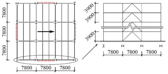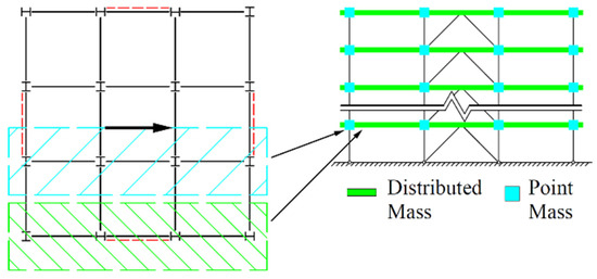 Though all floor members are ignored during the modelling process to reduce computational costs, their effects should be accurately captured, which could basically be divided into two aspects: restricting members’ out-of-plane torsion and providing inertia force under lateral loads. For the former, the out-of-plane displacement of the beam and column elements is constrained. For the latter, the non-structural distributed and point “Mass” elements are arranged, as shown in Figure 2, to achieve the equivalence of the representative value of gravity load. “Non-structural” refers to this kind of element that produces inertial force in the direction of seismic load, without any additional vertical load. The mass on the subordinate area of the brace span is transformed into the representative value of the gravity load and evenly distributed to the corresponding beams. The gravity-span counterpart is applied to the corresponding column of the brace span, in the form of point mass.