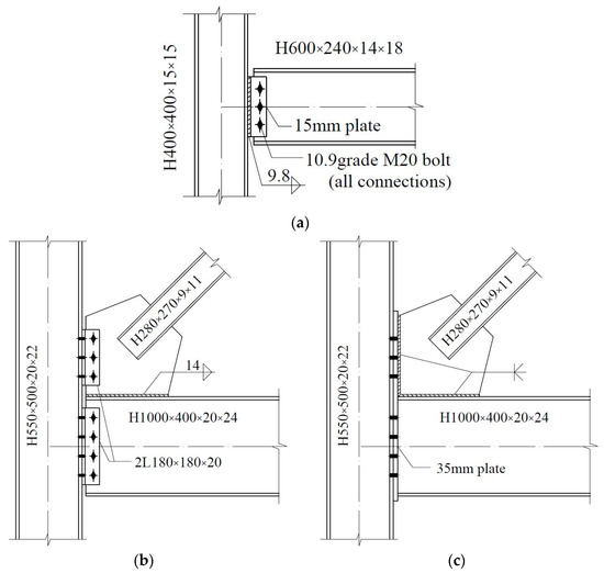 Connection details: (a) shear-tab connation; (b) double-angle connection; (c) end-plate connection (unit: mm).