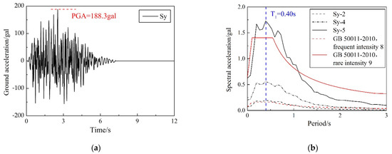 When selecting a reasonable ground-motion record, the spectral characteristics of ground motion were mainly considered. By scaling the ground-motion records, the acceleration-response spectrum of the selected record was equal to or slightly higher than the corresponding code-design-response spectrum. The Sy motion was introduced in the direction shown in Figure 5a. Sy, characterized by a peak acceleration of 188.3 gal and strong velocity pulses, was a synthetic motion created to match the GB 50011-2010 site class II 8-degree frequent-intensity earthquake spectrum. Figure 6a showed the acceleration history of the motion, whereas Figure 6b showed the acceleration-response spectrum. Shake-table tests were conducted by introducing the Sy motion several times, with the target amplification level increasing from 181.3 gal, 538.0 gal, 1668.0 gal, and 2218.4 gal, to, finally, 2351.9 gal, which represents the earthquake action from 8-degree frequent intensity and 8-degree basic intensity to 9-degree rare intensity and continuous, strong earthquake action. The frequent, basic, and rare intensity were the seismic intensity with the exceedance probability of 63%, 10%, and 2~3% in the 50-year-design reference period, respectively. Detailed loading protocol is summarized in Table 7.
