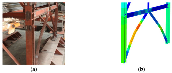 Using the method introduced in the previous section, a finite-element CBF model was established according to the member size of the shake-table test specimen, and a nonlinear time-history analysis under the same loading protocol was carried out. Based on the last continuous, strong ground motion (Sy-10) of the shake-table test, the failure mode of the numerical model was compared with the test specimen. At that time, the 1st- and 2nd-story braces had great out-of-plane residual deformation, while the whole structure did not collapse, which reflected the residual seismic-bearing capacity. It was obvious from Figure 7 that the failure mode of the finite-element model was very close to the test specimen, which was due to the serious out-of-plane deformation of the bottom braces.