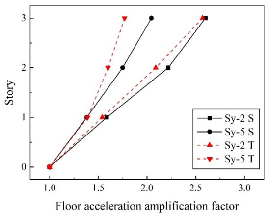 Figure 8 illustrated the roof-acceleration response under 8-degree frequent-intensity ground motion (Sy-2) of the test specimen and the numerical model. Figure 9 plots the distribution of the floor-acceleration amplification (FAA) under 8-degree frequent-intensity (Sy-2) and 9-degree rare-intensity (Sy-5) ground motions. As illustrated, the roof-acceleration response of the finite-element models correlated well with the experimental results. The FAA of each story was also well represented. In case of an8-degree frequent earthquake, the FAA increased with the story number. Under the condition of a 9-degree rare earthquake, the overall level of FAA decreased, which showed that with the enhancement of earthquake intensity, plastic deformation occurred and reduced the acceleration response of each story.