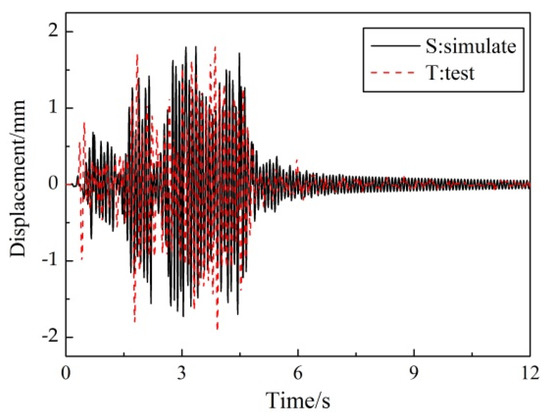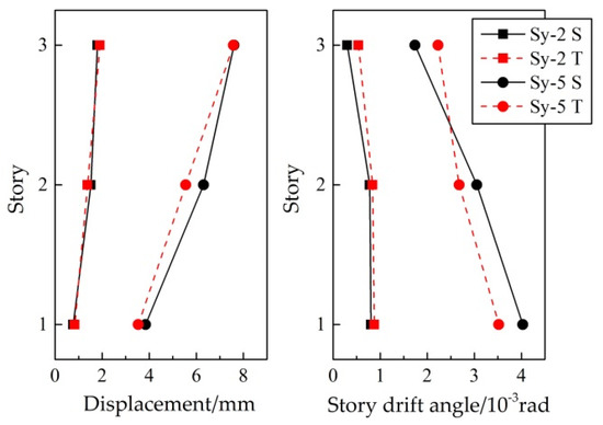 Figure 10 illustrated the roof-displacement response under the 8-degree frequent-intensity ground motion (Sy-2) of the test specimen and the numerical model. Figure 11 compared the envelope diagram of displacement and story drift under 8-degree frequent-intensity (Sy-2) and 9-degree rare-intensity (Sy-5) ground motions. The figure showed that the simulation traced the experimental response fairly accurately. Similarly, the maximum value of the story drift appeared in the bottom story, which was easy to form a weak story.