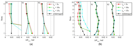 Δθmax of residual structure after first-story brace fails. (a) 4-story; (b) 10-story.