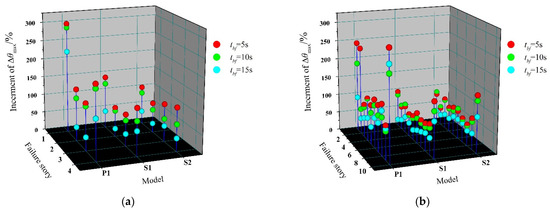 Considering the unexpected defects in practical engineering, the brace of any story may take the risk of fracture during a strong earthquake. Hence, the increment of Δθmax in the failure story, relative to the undamaged structure under the failure of different story braces, is further explored (Figure 16). When the first-story brace fails at a very early time, the increment of the first-story Δθmax in P1 reaches over 250%. In this case, the benefit of the reserve capacity is realized as it limits the increment of the first-story Δθmax in S2 to 105.02% and 79.21% for 4- and 10-story residual structures, respectively. What’s more, this increment falls to 34.76% and 30.71%, respectively, when tbf = 15 s, effectively preventing a soft-story mechanism, which leads to collapse in the baseline case after the initial failure of the LFRS. Increment of the failure story Δθmax, under the condition where the brace fails in the middle part of the structure, is relatively average, distributed mostly in the range of 30–80%.